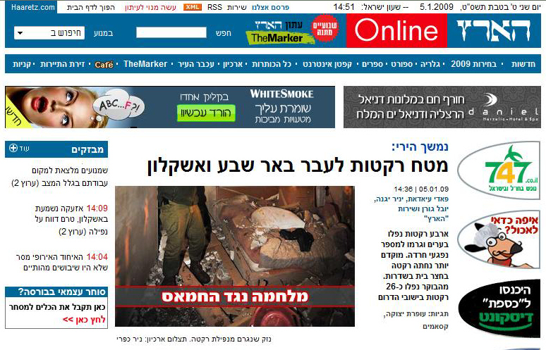 דוגמא לבחירה כזו היא התמונה שהופיע בהארץ אונליין ב-5/1/2009 בכתבה על נפילת טילי גראד בדרום: