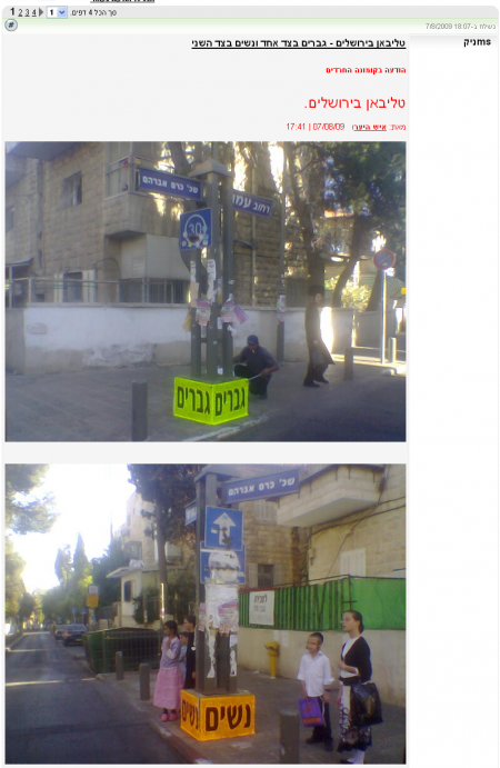 דורה קישינבסקי הצביעה כאן על בעייתיות בתמונה של ציפי לבני בכרזות הבחירות של קדימה. בשכונות מסויימות בירושלים ובבני ברק אין בעיה כזאת – מודעות הבחירות של יו”ר קדימה והמועמדת לראשות הממשלה פורסמו שם בלי תמונתה – כנראה כחלופה לכך שהיא תפורסם עם התמונה ותושחת. לפי הארץ, בירושלים לפחות מדובר בחוזה של חברת השלטים עם העירייה, שאוסר פרסום תמונות נשים במספר אזורים חרדיים בעיר, “זאת כדי לא לפגוע ברגשותיו של הציבור החרדי במקומות הללו”, לשון הדיווח.