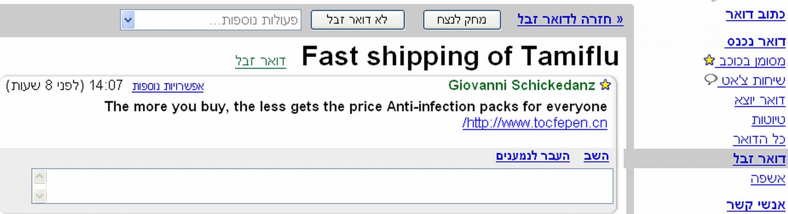 איך מושפע תמהיל דואר הזבל משפעת החזירים? במקום ויאגרה מזוייפת יש הרבה Tamiflu במחיר מבצע.