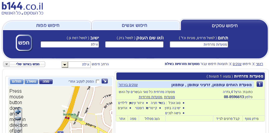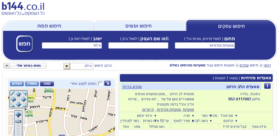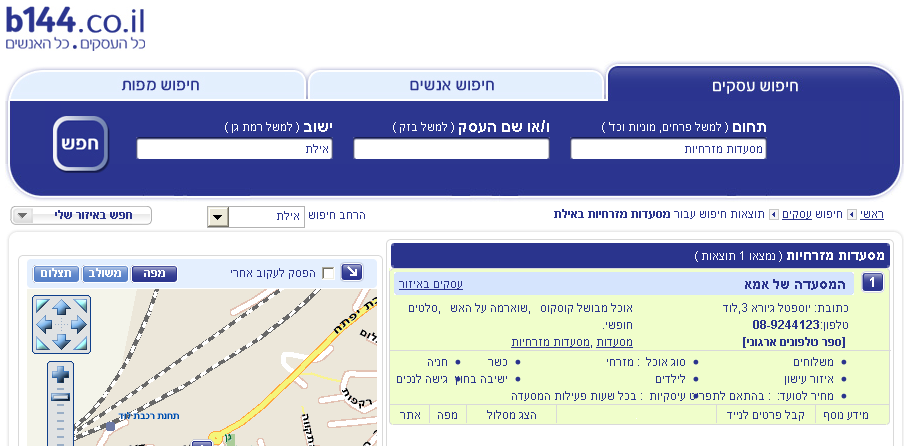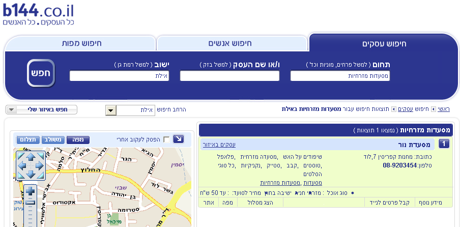 באג משונה באתר 144 של בזק: כשמחפשים מסעדות מזרחיות באילת, מקבלים מסעדות מזרחיות בהמון מקומות אחרים: