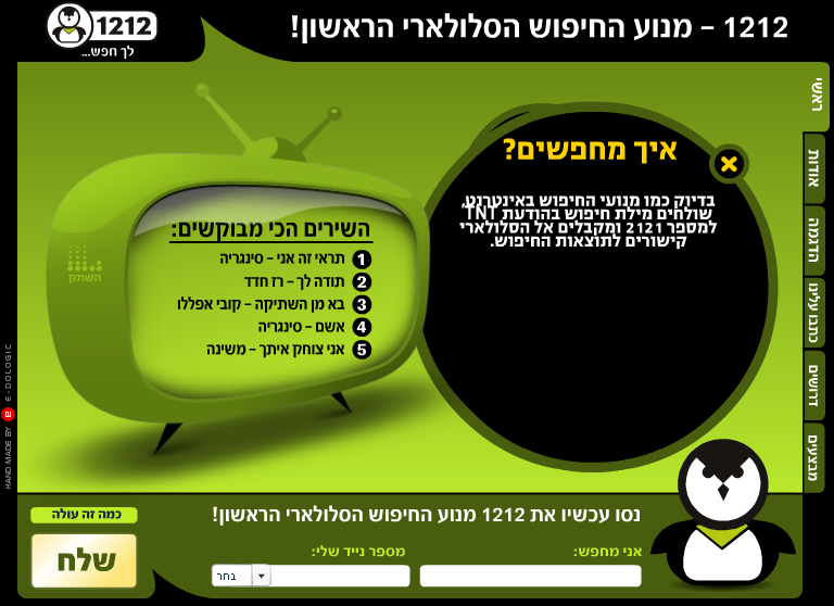 אתר “מנוע החיפוש הסלולארי הראשון” 1212 מסביר שמנועי חיפוש מבינים רק כוח – ובפרט כוח נפץ. אז אם אתם מחפשים משהו, שלחו להם הודעת TNT.