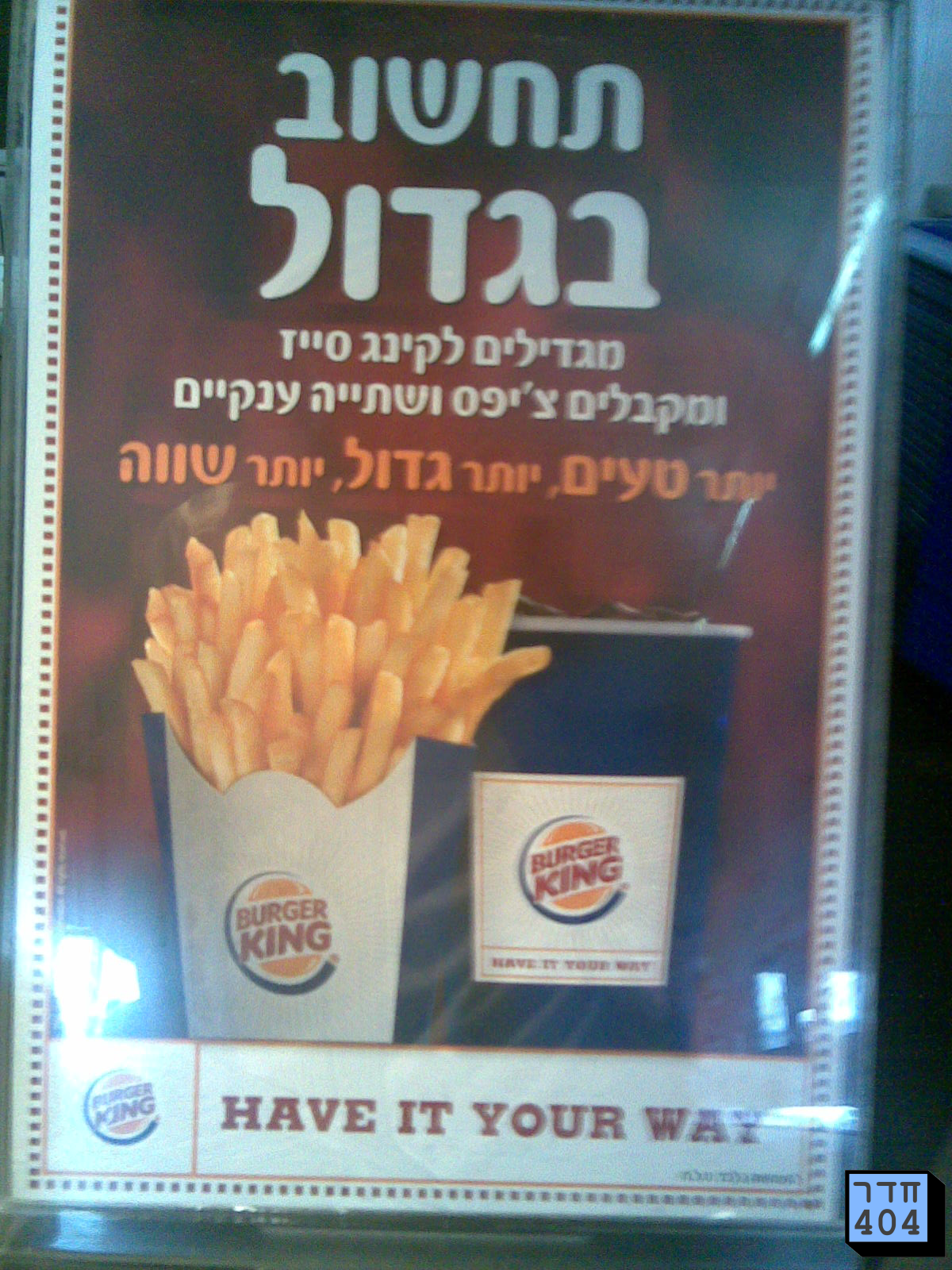מודעה של בורגר קינג (ברגר אמא שלכם) מבקשת מהלקוחות להגדיל את הצ’יפס והשתיה ל”קינג סייז” כי זה “יותר טעים, יותר גדול, יותר שווה”.