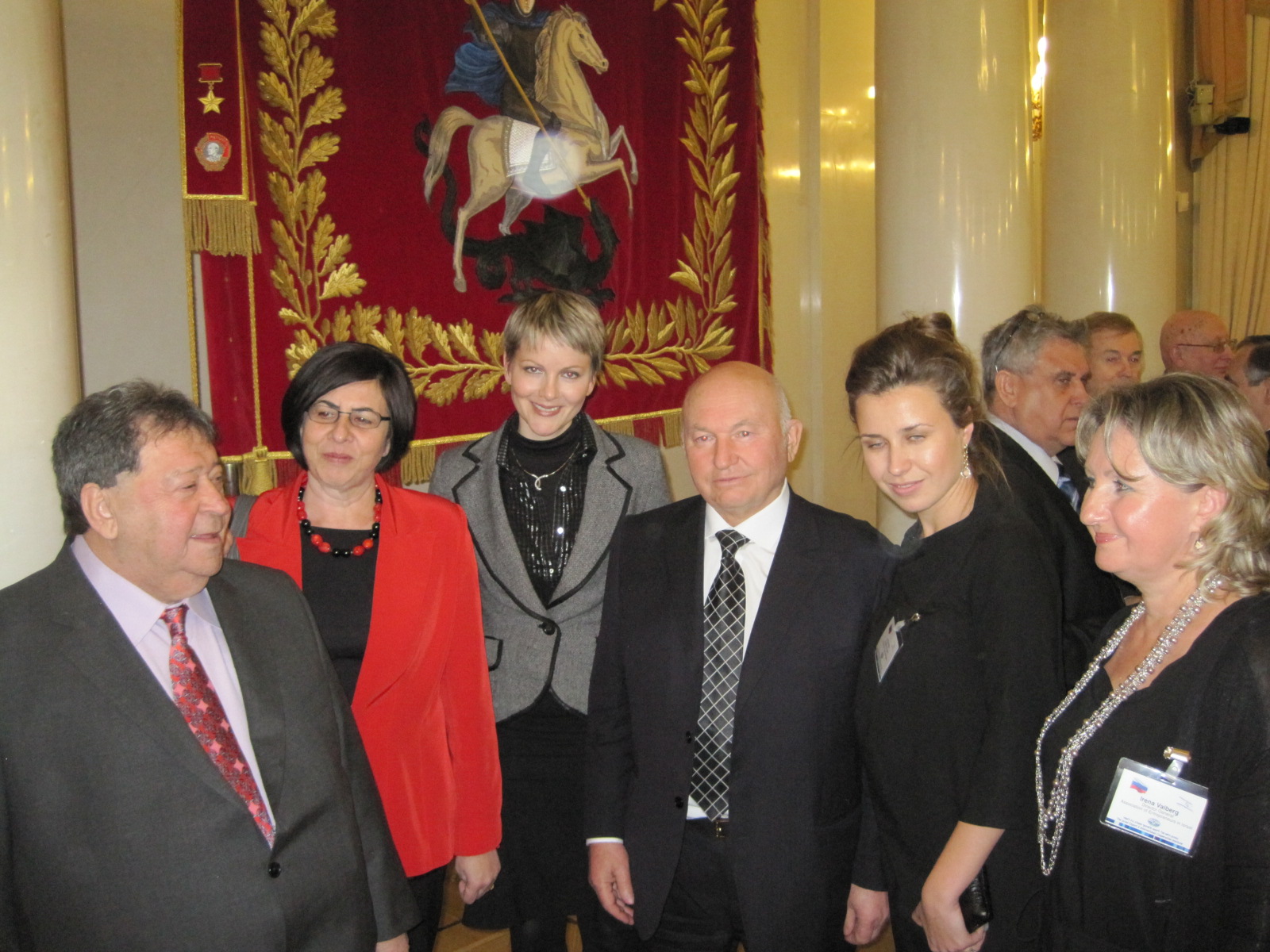 בתמונה (6340) : השר בן אליעזר, ראש עיריית מוסקבה יורי לוז’קוב וחלק מהכוח הנשי שבמשלחת.