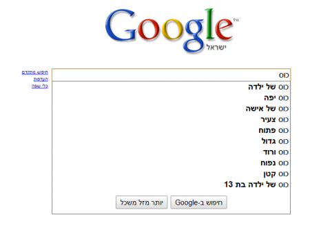 רוני שוחט כותב לי: “רציתי לחפש לפני כמה ימים תמונה של כוס יין, אז כתבתי בגוגל כוס וקיבלתי הצעות מגוגל תוך כדי ההקלדה. כנראה בגלל המשמעות הכפולה של המילה גוגל לא חסמו את התצאות כמו שהם עושים עם מילים אחרות בעלי אופי מיני”.