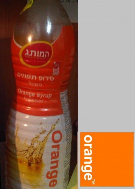 בקבוק סירופ התפוזים המשומר הזה הוא מתוצרת “המותג”, המותג הפרטי של רשת ויקטורי, שירלי סיידלר, שפרסמה את התמונה, חושדת שחברת אורנג’ העניקה חסות לבקבוק הזה. אני לא אתפלא אם אורנג’ מפרסמת ככה, ורשת ויקטורי מסבסדת כך את מחיר הסירופ. אפשר היה לחשוד שמישהו פשוט גיגל וקיפסט לוגו של אורנג’ לאריזת המשקה, אלא שבאורנג’ ה-o קטנה ובבקבוק ה-O גדולה. יתכן שהגרפיקאי האלמוני השתמש, במקרה או לא, בגופן שמשמש את אורנג’. בכל מקרה, אל תשתו את זה, זה נראה רעיל.