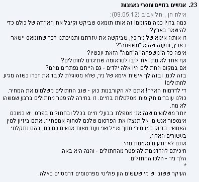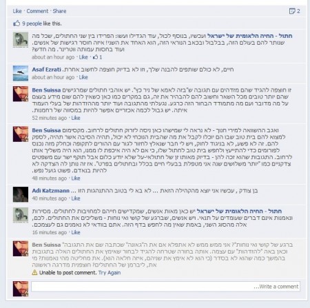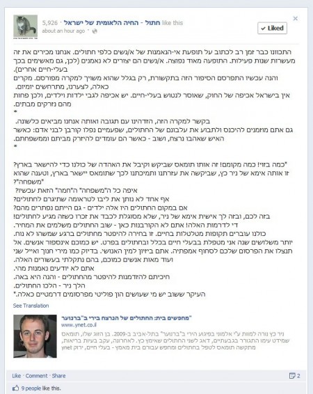 הנה הסטטוס חי וקיים, עם 281 שיתופים, 129 לייקים ו-183 תגובות, 81 מהן מהיממה האחרונה. והנה צילומסך, למקרה שזה כן יימחק בעתיד הקרוב.