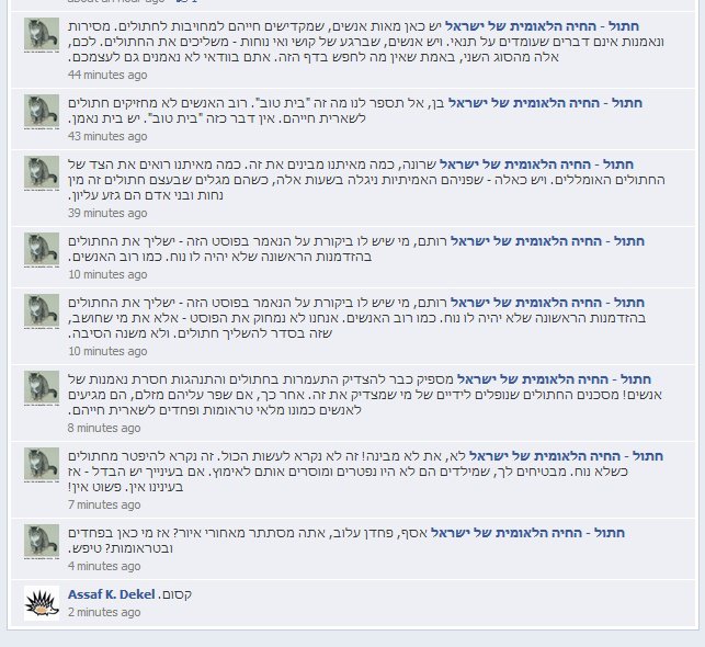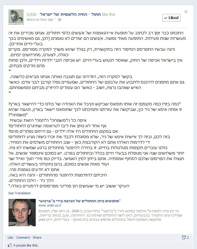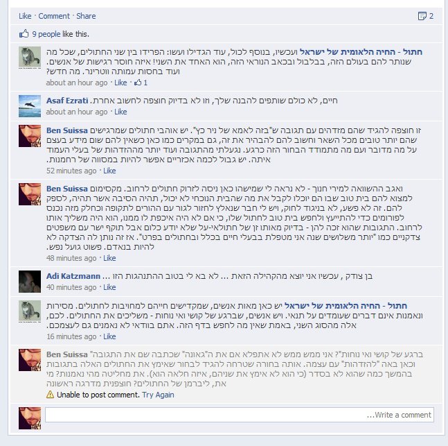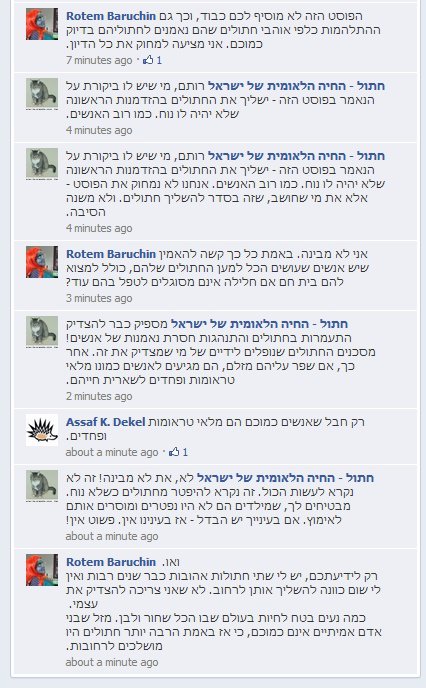 הטוקבק צוטטה גם בדף הפייסבוק “חתול – החיה הלאומית של ישראל” (5922 חברים):