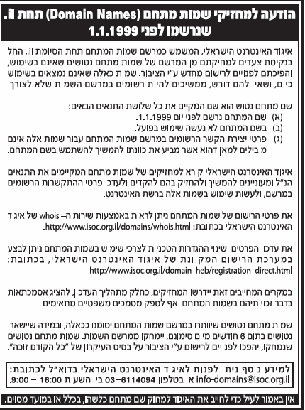 עד סוף 1998, מי שביקש להחזיק בדומיין ישראלי בסיומות co.il או org.il נדרש לפעולת רישום חד-פעמית, שבשנים המוקדמות אפילו לא היתה כרוכה אפילו בתשלום, ומאותו רגע הדומיין היה בשליטתו, בלי הגבלת זמן. משמעות הדבר היא שכ-9000 הדומיינים שנרשמו עד סוף 1998 נשארו בידי הרושמים ולא משתחררים בחזרה לציבור, גם אלה מביניהם שלא נעשה בהם כל שימוש, ואפילו אם בעליהם החליט לנטוש אותם לחלוטין. ב-1/1/1999 שונו כללי רישום הדומיינים, ובין השאר נוספה חובת חידוש של הדומיין מדי שנתיים בתשלום.