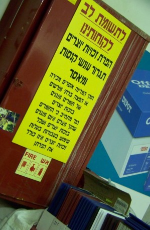 הסיפור הזה, שהגעתי אליו דרך ולווט, הזכיר לי שבסניף דן איילון של אופיס דיפו, בפינת צילום המסמכים, ראיתי את אזהרת הקופירייט הע-נ-קית הבאה, שמשולה לאזהרת “החוק וכן עשרת הדברות אוסרים על רצח” במחלקת הסכינים של חנות כלי בית: