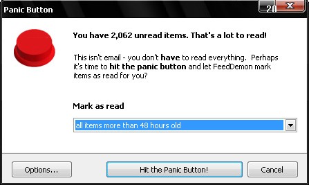 מכירים את זה שאתם לא מתחברים לאינטרנט כמה ימים ובשובכם מגלים אלפי פריטי RSS שלעולם לא תספיקו לקרוא? ג’יובל מהבלוג “האויב הציני” אסף בשבועיים של צבא יותר מ-2000 פריטים כאלה, וגילה שקורא ה-RSS שלו, FeedDemon, ערוך למצב החירום עם כפתור אדום, שלחיצה עליו מוחקת את כל הפריטים בלי ייסורי מצפון.