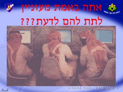 מאז ומעולם חשפו חיילים ומילואימניקים מידע מסווג. הבעיה החמירה כשהגיע האינטרנט, וביתר שאת עם התפרצותן של הרשתות החברתיות, וצה”ל מנסה לפעול בנושא. ל”כלכליסט” הגיע עותק של מצגת שהכינה מחלקת בטחון מידע באגף התקשוב. תחת הכותרת “רשתות חברתיות – הטוב, הרע והמכוער”, המצגת מסבירה בקצרה מהן רשתות חברתיות (“הטוב”), איזה מידע אישי נצבר בהן (“הרע”) והשימוש ש”גורמי מודיעין אויב” עושים במידע הזה (“המכוער”). החיילים מונחים לא לפרסם שמות ומספרי יחידות, כינויים, קורסים ותפקידים מסווגים, ולא להפעול בקבוצות לפי יחידות צבאיות. הם כן מורשים לפרסם שיוך חיילי, תפקידים לא מסווגים וכמובן פרטים אישיים שלא קשורים לצבא. המצגת מסתיימת בתמונה של שלושה ערבים עטויי כאפיות גולשים באינטרנט, ומעליה, באותיות אדומות: “אתה באמת מעוניין לתת להם לדעת???”