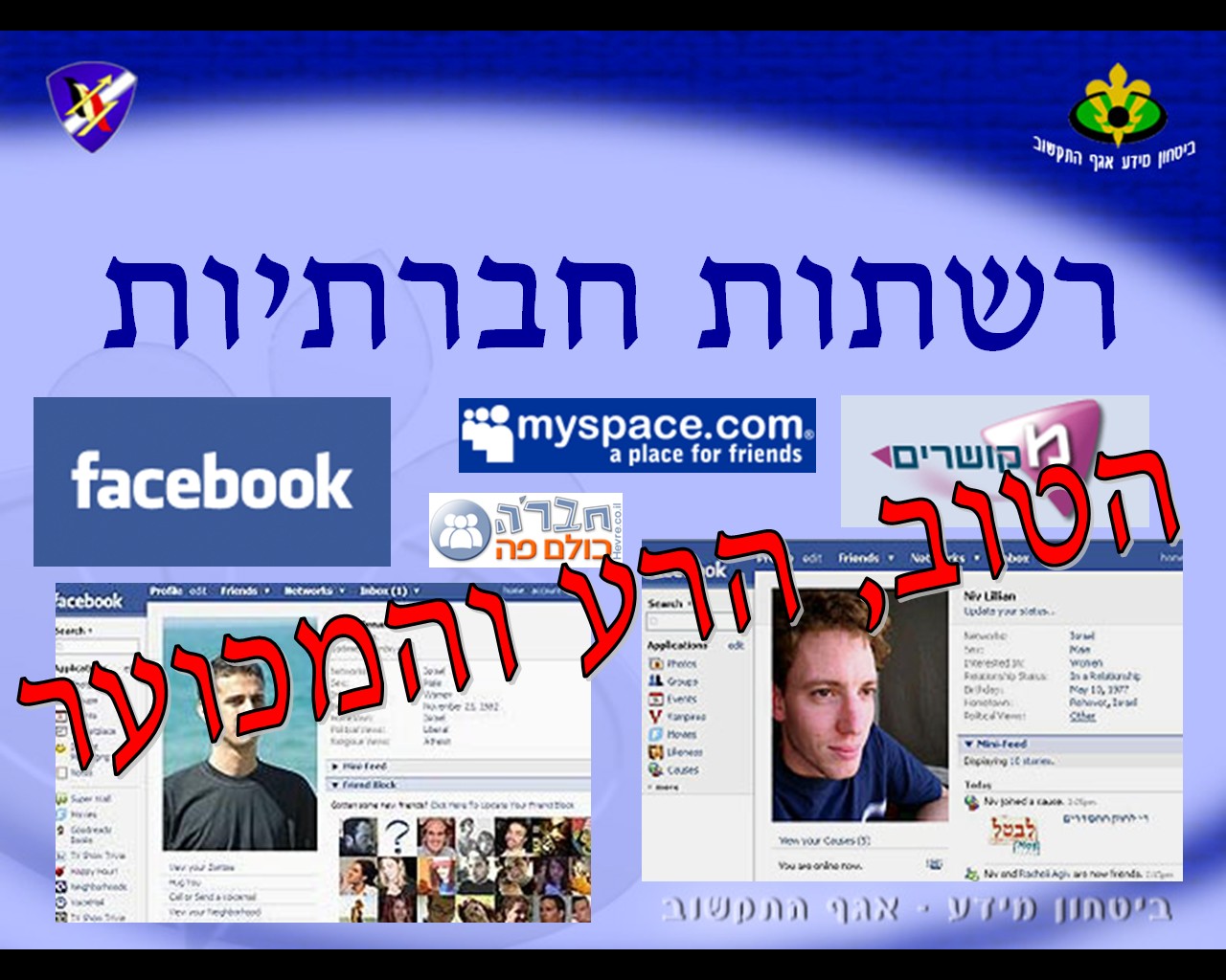 אגב, פרופילי הפייסבוק בעמוד הראשון של המצגת שייכים לניב ליליאן ואהוד קינן מ-ynet; מי שהכין את המצגת כנראה גנב אותן מהכתבה הזאת ב-ynet. אהוד קינן מסר בתגובה: “כמי שהגיע לדרגת מלש”ב בלבד, אני שמח שפרצופי מהווה אות ומופת לחיילי צה”ל באשר הם”.