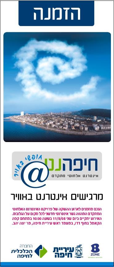 לפי הקומוניקט, מדובר במיזם של החברה הכלכלית לחיפה וחברת B-Zone. “הרשת מכסה כיום את כל טיילת דדו בחיפה ומאפשרת לכל בעל מחשב נישא, המצויד בטכנולוגיית WiFi, להתחבר לרשת האינטרנט ולגלוש ללא תשלום וללא הגבלה. בדיקת ההיתכנות של המיזם, תבוצע בשלב הבא, שיחל בעוד כארבעה חודשים, באמצעות רישות של ציר מוריה בכרמל. ההצלחה המסחרית של המיזם בכרמל, תקבע את המשך הרחבתו לשכונות נוספות בחיפה”. איזו היתכנות בדיוק בודקים? שאינטרנט אלחוטי עובר גם באוויר מזוהם? ומה בדיוק המדד להצלחה מסחרית של חיבור חינם לאינטרנט? שאנשים משתמשים בו?