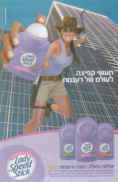 הם לקחו את היד מפרסומת לספרי , והדביקו לה את הדאודורנט, ואת כל זה שמו על הבחורה. לי זה נראה כאילו היא תיכף מתיזה עלי גז מדמיע.