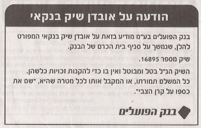 […] כתבתי פה פעם על השפה המעצבנת של מודעות אובדן הצ’קים של הבנקים. בהערת אגב תהיתי מי אמור לראות את המודעות האלה ולזכור את המספרים המופיעים בהן. האם בעלי עסקים גוזרים ותולים את המודעות הללו על הקיר? האם אנשים מחזיקים את גזירי העיתונים הללו בארנק ובודקים אותם מול כל צ’ק שהם מקבלים? […]