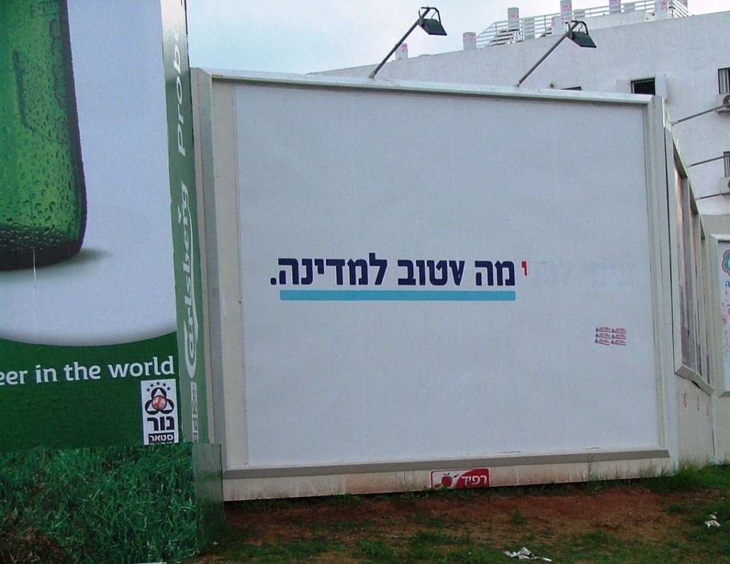 […] קדימה פרסמה כרזות של ציפי לבני ללא תמונתה בבני ברק שמה של ציפי לבני קולף מכרזה בבני ברק תמונתה של שלי יחימוביץ' קולפה מכרזת פרסום של מפלגת […]