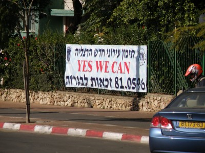 תיכון עירוני חדש הרצליה, שהביא אותה בכמובמה כשהעתיק את הסיסמה Yes, We Can” לשלט פרסום על שיעור ההצלחה בבגרויות (ובאופן אירוני בהקשר הזה, בלי פיסוק ועם קפיטליזציה מיותרת). אסף שגיא צילם בהרצליה: