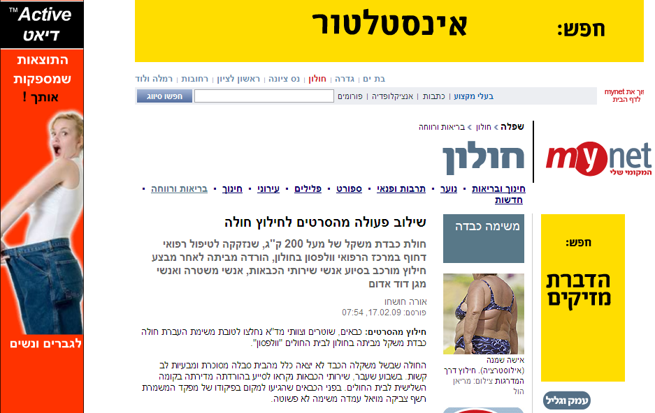 לצד הידיעה העונתית וחסרת ההצדקה העיתונאית (ומלוות האילוסטרציה הגסה) על אישה שמנה שחולצה מדירתה באמצעות כוחות ההצלה, מודעה להרזיה. הלשין אוהד קצין.