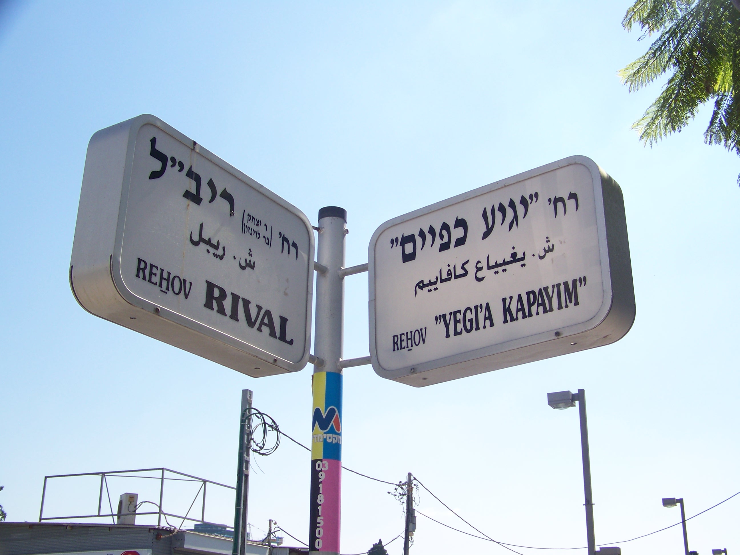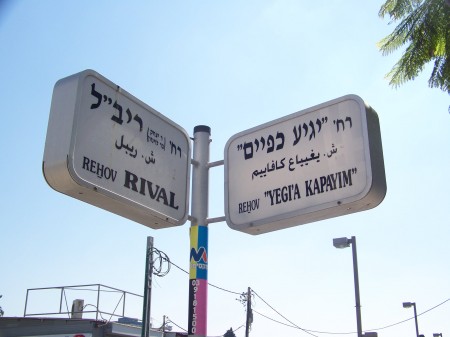 בשלט של רחוב יגיע כפיים יש לפחות עוד שתי טעויות. בתעתיק לערבית אפשר לסלוח על ה-ف (פ’ רפויה) כתעתיק ל פ’ הדגושה, אבל לא על שני ה־ي־ם ב”يغيياع” (“יגייאע”). בתעתיק לאנגלית – הפתח תחת הע’ הוא פתח [של תנועה] גנובה, כלומר התנועה נהגית לפני העיצור ולא אחריו. לכן צריך להיות “Yegia’” ולא “Yegi’a” (שמתעתק “יגיעה”).