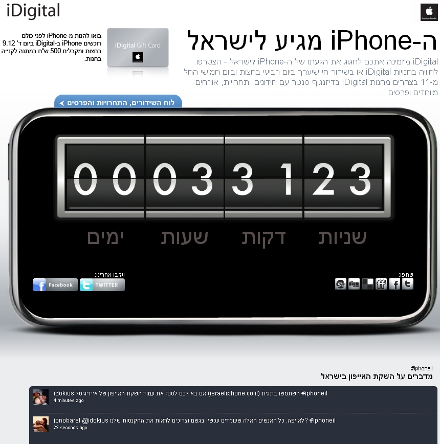 איידיגיטל פתחו עמוד עם ספירה לאחור להשקת האייפון, שבהמשך ישדר חי מההשקות. בתחתית העמוד יש פיד של טוויטר, שלוקח טוויטים עם התגית #iphoneil. אם יש לכם ביקורת על המכשיר הגרוע והסגור הזה, או על הכבשים שעומדות בלילה בתור כי הן חייבות להיות הראשונות שיש להן אייפון בישראל חוץ מהרבבות שכבר מחזיקים במכשיר פרוץ, צייצו עם התגית הזאת.