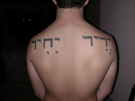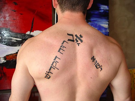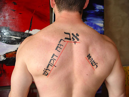 טימות’י פרדריק, בן 48, צלם פרילנס מיוסטון, טקסס, נושא על גבו את הקעקוע השגוי “אָב ישׁוּא רוּח הקדוֹשׁ”. “הקשר שלי לעברית מבוסס לחלוטין על אמונה או רוחניות: אישי”, סיפר לי פרדריק בראיון אימייל. “אני קתולי [Roman Catholic], אבל תמיד היה לי קשר לא מוסבר לעברית. אני זוכר את הפעם הראשונה שנוצרה הזיקה המוזרה הזאת בילדותי, עם ילדה שחיבבתי מבית הספר. היא לא השתתפה בהצגת הכריסמס של בית הספר/הכיתה, וכשגיליתי שהסיבה היתה שהיא יהודיה, חשתי יותר קרוב אליה מאשר שונה ממנה. מגיל צעיר תמיד הצהרתי, בשיחות טפשיות על אמונה, שלו עזבתי את הדת הקתולית הייתי הופך ליהודי ולא לפרוטסטנטי. בהקשר לקעקוע, בעצם רציתי לעשות אותו בארמית, השפה/דיאלקט של ישו. לא הצלחתי למצוא מישהו מקומי שיודע ארמית, ואחרי קצת הסתייגויות, חבר יהודי כתב את הקעקוע העברי שאני נושא עכשיו. הסיבה שבחרתי לעשות את הקעקוע בעברית ולא באנגלית היתה, שוב, מסיבות של אמונה, אישיות לי. כמו כן, אם אני הולך לשאת קעקוע שמבטא את הקשר האישי ביני לבין אלוהים, לעשות אותו בעברית הוסיף לזה מסתורין, בעיניי. הקעקוע אמור היה לומר ‘Abba, Jesus, Holy Spirit'”.