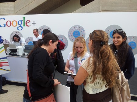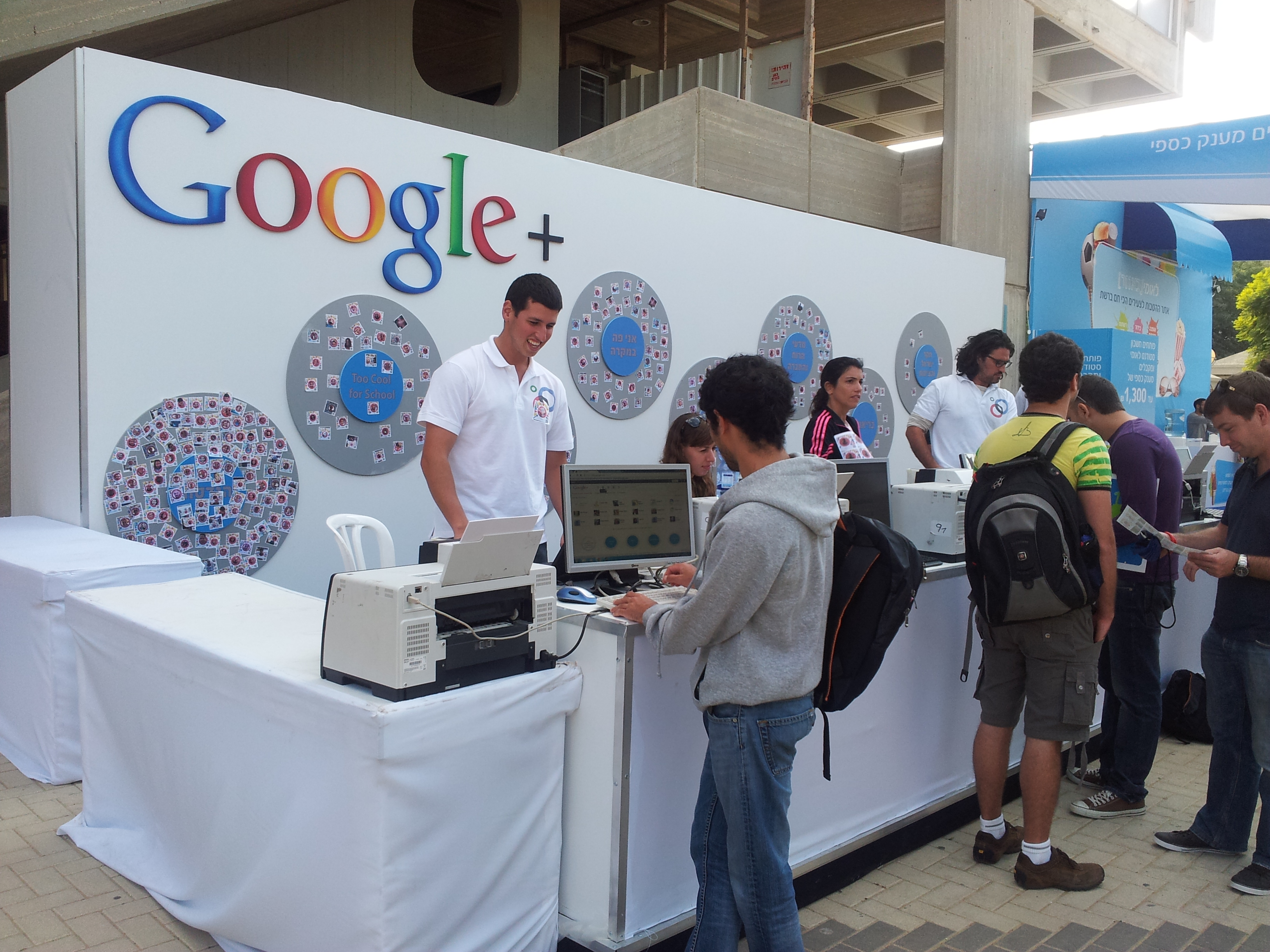 ועכשיו, כאמור, דוכן גיוס, שהוצב באוניברסיטת תל אביב בתחילת השבוע ואתמול והיום באוניברסיטת באר שבע. “הרעיון הוא לפתוח לאנשים חשבון בגוגל פלוס, בנוסף אנחנו רוצים שהם יוסיפו אנשים למעגלים שלהם כדי שהרשת תגדל”, מספרת אחת ממפעילות הדוכן שאחראית על צילום תמונות הפרופיל. “הרבה אנשים לא מכירים את הרשת, אז אנחנו מספרים להם קצת על הרשת החברתית והיתרונות שלה על הרשתות האחרות”.