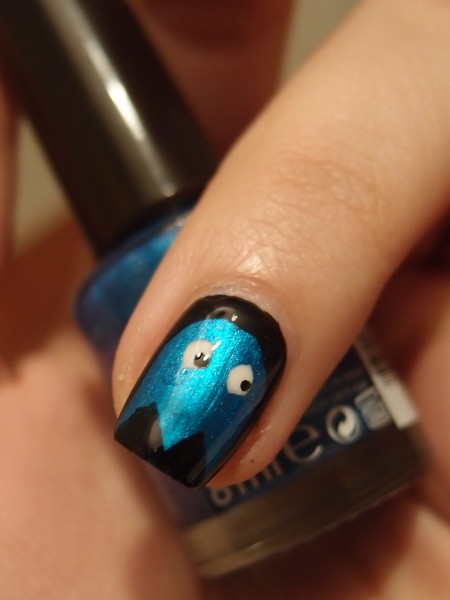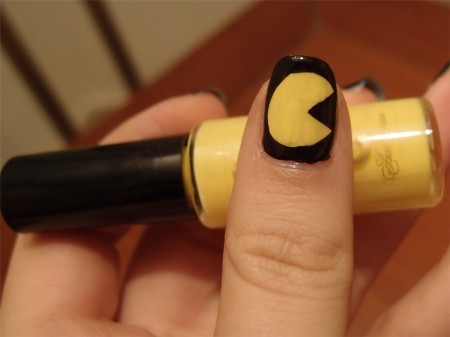 בואו נתחיל מלדבר על פקמן עצמו. הצהוב בו השתמשתי הוא צהוב מתוך סט ללא שם או מספר של גולף. השחור הוא ליינר שחור מבית LA Colours. לאחר מריחה של הצהוב והמתנה סבלנית עד שיתייבש, קחו את הליינר (לק שמגיע עם מברשת דקה וארוכה, בד”כ באריזה דקה וארוכה) השחור שלכן או את מברשת הציור הדקה הטבולה בלק שחור, וציירו מעגל גדול ככל האפשר. מאמצע המעגל הוציאו שני קווים אל קצהו כדי שיצרו את הפה – שימו לב באיזה כיוון אתן מעוניינות שיהיה הפה של הפקמן. לאחר מכן, מלאו את כל השטח שמסביב למעגל, ואת הפה של הפקמן, בשחור באמצעות המברשת.