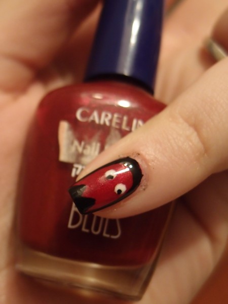 את השדים קל עוד יותר לצייר. כצבעי בסיס השתמשתי בתכלת Azure מבית רימל אותו הזכירה לאחרונה החברה הדמיונית, ובאדום מס’ 216 של Careline Blues. באמצעות הליינר השחור (או המברשת, כמובן) עברתי על בסיס הציפורן של שתי הציפורניין וצבעתי אותו בשחור. יישרתי את הגבול השחור מעט כך שהצורה הנותרת תהיה עגולה לחלוטין. למטה יצרתי עם המברשת הדקה/ליינר זוג משולשים שווים. חשוב לזכור שגם אם המשולשים לא ממוקמים טוב בדיוק באמצע הציפורן, אפשר להוסיף עוד מעט כחול באחד מצדי הציפורן מה שייצור שד רזה יותר, אבל לא פחות מוצלח.
