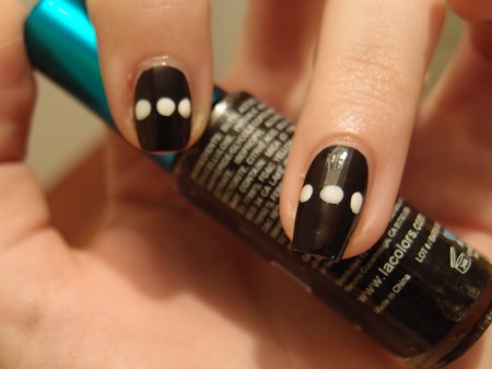 את הנקודות הללו, כמו גם את העיניים של השדים, יש ליצור באמצעות מנקד. אם אין לכן מנקד בבית, הקצה ההפוך של מברשת ציור או מחט יכול לשמש כמנקד מצויין. ללבן במקרה הזה השתמשתי ב-Snow של China Glaze. את הנקודות השחורות שבעיניים של השדים יצרתי באמצעות נגיעה מקצהה של המברשת השחורה.